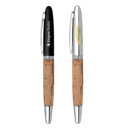 The cork roller ball is an elegantly designed, roller ball pen. Cap off pen. Cap is coated with matte black lacquer or shining chrome finish. Barrel is made from naturally soft, cork tissue.