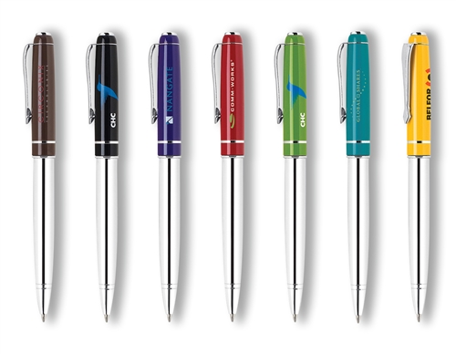 Twist action aluminum ballpoint pen with lacquered colored cap with enamel coating finish and chrome barrel.