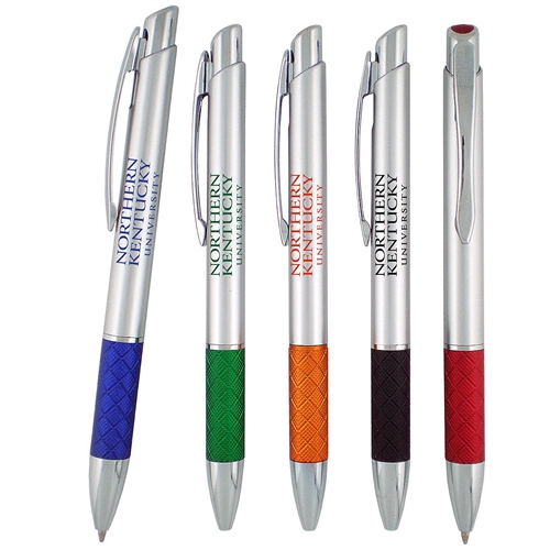 The Carlton Pen has single color printing in an assortment of colors. Silver barrel with colored grip. Chrome highlights.