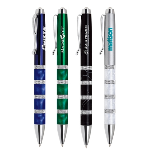 The Phoenix is a stylish & heavy, twist action brass ballpoint. Unique alternating diamond cut bands and agate-look resin barrel design with color matching simulated diamond, embedded top.