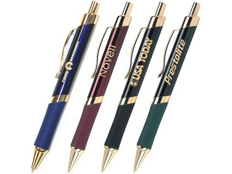 Incredibly designed European-look push retractable ballpoint pen. Stylish 24 Karat gold plated accents. Gold engraved imprintColorful matching rubber grip. Each pen is individually cellophaned.