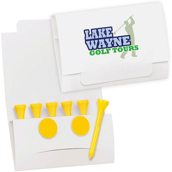 Make your day on the golf course complete when you market the 6-2 Golf Tee Packet - Value Pak! The 3 5/8"w x 2 5/8"h x 1/2"d golf tee packet includes six, 2 1/8" tees and 2 ball markers. Made in the USA, the packet is made of paper, tees are made of wood and the ball markers made of plastic. The product offers you the ability to imprint a personal message or your company name or logo!