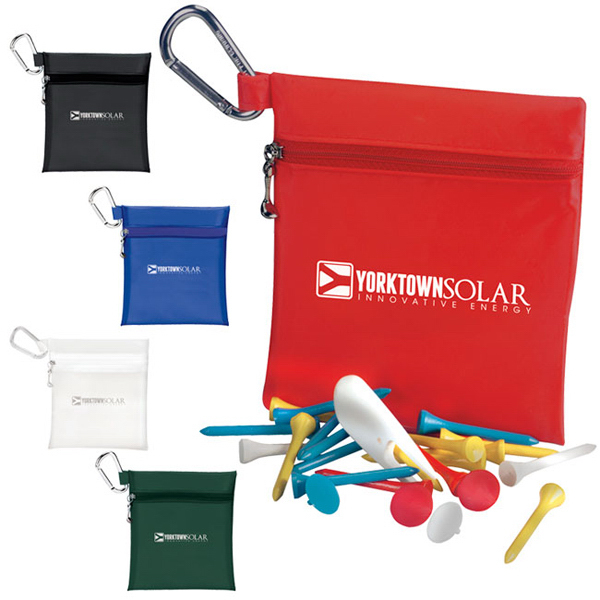 Keep everything together on your day on the course with the Champion Golf Jumbo Zipper Pack - Value Pak! Our 5-1/2"w x 6-1/4"h x 1"d jumbo zipper pack contains 20 2-3/4" tees, 4 ball markers and 1 divot repair tool. The product also has a handy metal carabiner to hook on your golf bag or belt. The case is made of PVC (polyvinyl chloride) 70 denier nylon, tees are made of wood and ball markers, divot fixer are made of plastic.