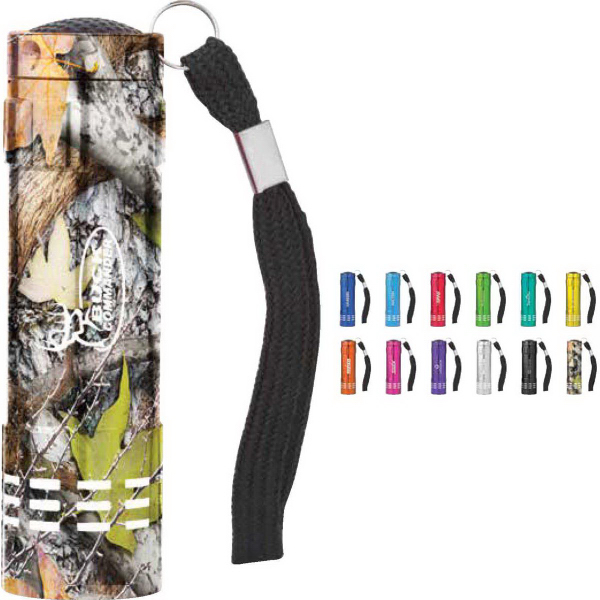 Lightweight, Rich enamel color finish body with metallic Silver accent, decorative dimple and ribbed accents, 9 bright White LED bulbs, Easy-to-use big Black push button. Includes Black strap and batteries. **DISCLAIMER: Due to certain chemicals in hand sanitizers, creams, and detergents rubbing off screen imprinted logos, the recommended imprint method is laser engraving which will not rub off.