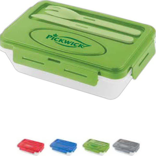 Lightweight and compact 2-piece lunch container, BPA free, Bold color PP snaptight\nclosure lid with frosted clear PP base, Matching color knife and fork attached to lid\n so you will never forget your utensils, Contained area for condiments under the lid with\na matching color cover, Microwave safe. Measures 2 1/2" H x 8 3/4" W x 5 1/2".