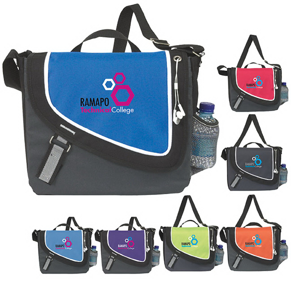 Exclusive. Atchinson (R). An Edge Above. 600 Denier Polyester. A Step Ahead Messenger. Listen to music while carrying your messenger, complete with velcro closure on main compartment and headphone port. Hook-and-loop closure on front flap and main compartment. Organizer panel and headphone port. Mesh water bottle pocket. Adjustable shoulder strap. Product Size: 13-1/2" w x 12 1/4" h x 3 1/4" d.