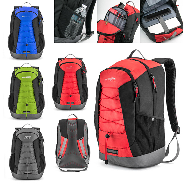 Designed with two large zip compartments; the front section features internal organization pockets and a key/accessory clip. Large back compartment includes padded laptop and tablet pockets. Interior felt lined sunglass/phone pocket and two external water bottle pockets. External bungee cords for stowing additional gear or layers. Air Mesh Padded Straps for comfort and reflective front detailing for safety. Made with durable 600d/420d/ripstop material for long wear. Fits most 15" - 17" laptops