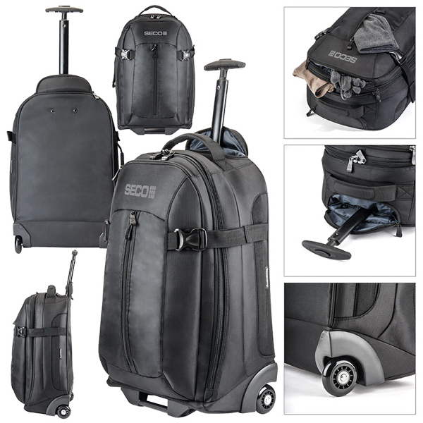 Built to travel - it is the perfect carry-on size rolling bag! Handsome black 1680D Cross Weave construction, Large main compartment with heavy lockable dual-zipper, Front flap small top accessory pocket with zipper, Large front vertical zipper pocket with interior protective mesh flap - to alleviate content spillage, Sturdy wheels with smooth ball bearing operation, Front plastic stability bar, Padded top handle, 2 side web straps to secure closure, Retractable telescoping handle- packs away in zippered compartment for easy storage.