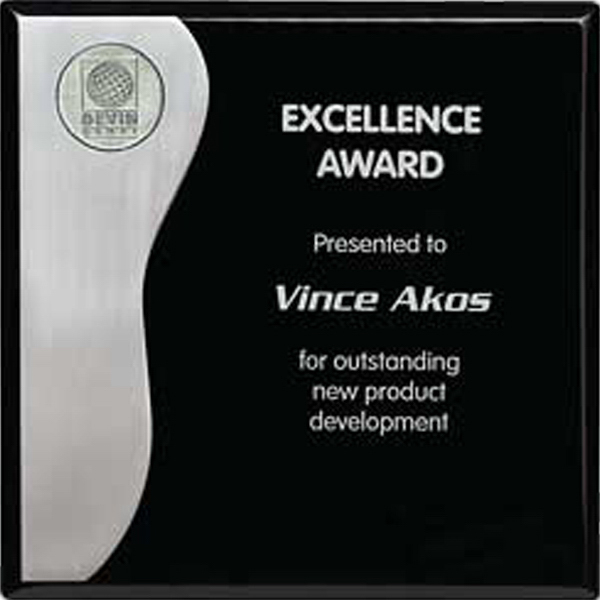 The Black with Aluminum Plaque provides the perfect background while the aluminum makes this award contemporary! It can be displayed via wall mount or stand alone. A polished brass loop stand is included. Each piece is made of a natural occurring material; slight variations may be present. Dimensions are 8" W x 8" H x 3/4" D.