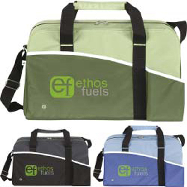 Be the "center" of attention when featuring this item. This ECO duffel is spacious for one going to the gym. Made of 45% recycled PET* material; our Center Court Duffel features a zippered main compartment and full front slip pocket with water bottle pocket. This 18"w x 10-1/2"h x 9"d bag also has adjustable shoulder strap with fabric wrapped carrying handles and leaf label. Atchison (R), 4 Color Process, goinggreen (R) and free 24 hour service.