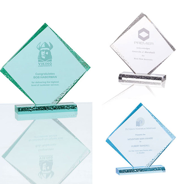 Put the "jewels" in your company on permanent display by bestowing the Diamond Ice award! This medium-sized acrylic trophy makes a perfect prize for sales goals, partnerships and lifetime achievement. Stunning from every angle, the facets on all sides make this award very interesting. Available in clear, blue and green, this 10" W x 9-5/8" H x 2" D trophy beautifully shows up your corporate logo and message. Recognize your achievers by ordering now!