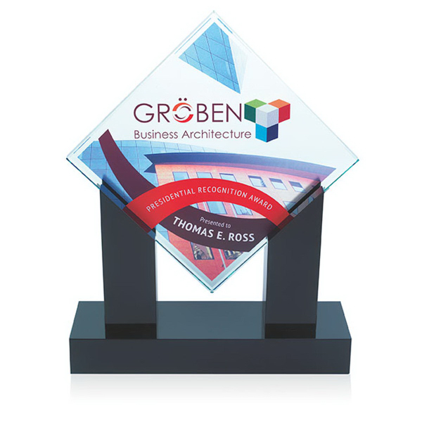 The sleek design of our Diamond Jade Award sits within a black marble base for a handsome look! The veining of each marble base will vary. This distinctive diamond-shaped trophy measures 8-1/2" W x 10-1/2" H x 2-1/2" D. It brilliantly displays the imprint of your recipient's message and your logo. For additional locations, please call for adjusted lead time. An opaque or translucent BritePix imprint is available. Specify when ordering.