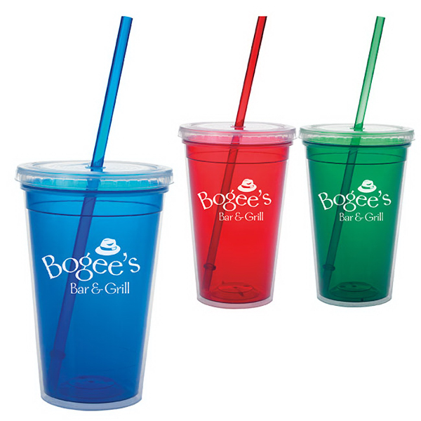 18 oz. double wall translucent tumbler. Features a clear outer wall with a colorful, translucent inner wall. Includes a snap-on lid and color-matching straw. Intended for cold beverage use only. The tumbler measures 3 3/4" dia x 5 9/16" h and reaches its 18 ounce capacity when filled to the rim. Made in the USA. BPA free.