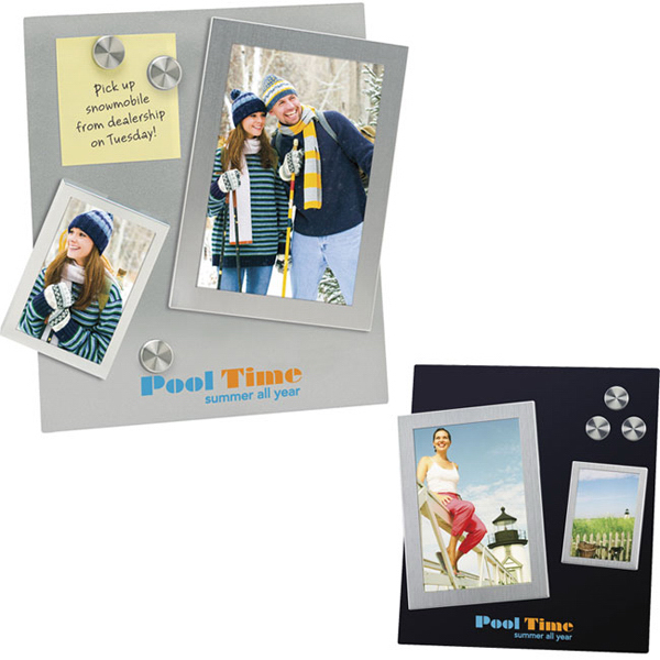 Magnetize your campaign with the best! The dual magnetic frame with stand consists of an easel-style magnetic stand with 2 different-sized magnetic frames and magnets for important papers. The set includes one 4" x 6" magnetic frame, one 2 1/2" x 3 1/2" magnetic frame, and three magnets. A perfect gift for clients or employees, your silkscreened company logo or custom design displays beautifully along with your recipient's photos and messages.