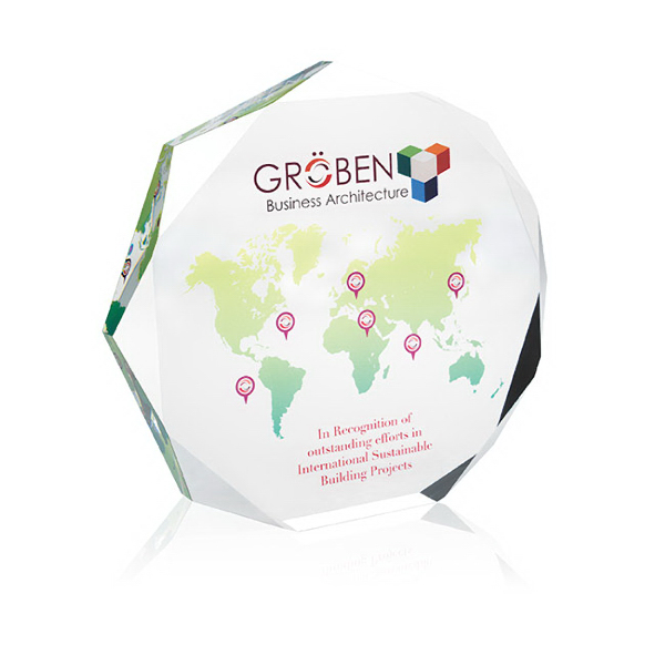 What an economical way to show your appreciation! Our Enterprise Octagon Award is a classic-shaped acrylic award that will elegantly show off your logo and copy. This award is thrifty but timeless. An opaque or translucent BritePix imprint is available; please specific when ordering. This clear octagon measures 7-1/2" W x 7" H x 1" D and beautifully displays the message to your winner. This trophy will grace the desk of a proud achiever!