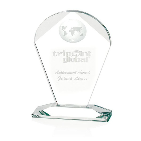 Make a "global" display of gratitude for their hard work and dedication! The eye-catching design of the small Geodesic Award is the perfect place to display recognition or appreciation. This 4-3/4" W x 6-3/4" H x 2-1/4" trophy is one of many designs available with deep-etched customization that shows up beautifully on this crystal prize. The globe inset and unique design will keep this award on your recipient's desk for a long time to come!