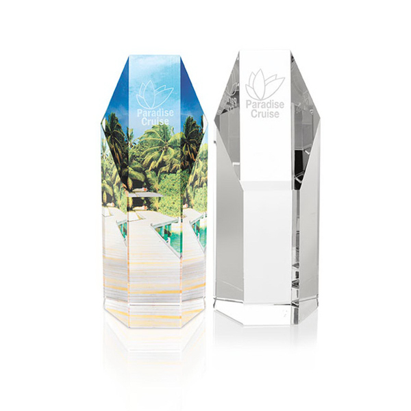 Elegance and excellence are the hallmarks of this award! The optical crystal hexagonal tower award measures 2-1/2" x 7-1/4" and will stand out wherever it sits. Due to the handmade production method, these pieces may vary slightly in height and overall size. An opaque or translucent BritePix imprint is available. Please specify when ordering. Your recipient's name and your logo take center stage on this gleaming trophy. A base is also available.
