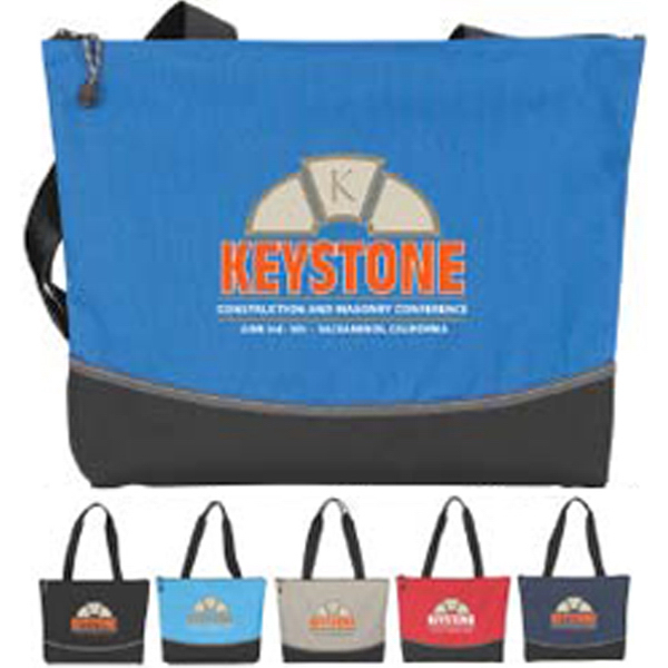 Exclusive. Atchinson (R). An Edge Above. 600 Denier Polyester. Indispensable Everyday Tote. This is your everyday tote perfect for trade shows with the large zipped main compartment and the shoulder-length handles. Zippered main compartment. Interior organizer drop pocket. Shoulder-length handles with sewn grips. Product Size: 17 1/2" w x 14" h x 3" d.