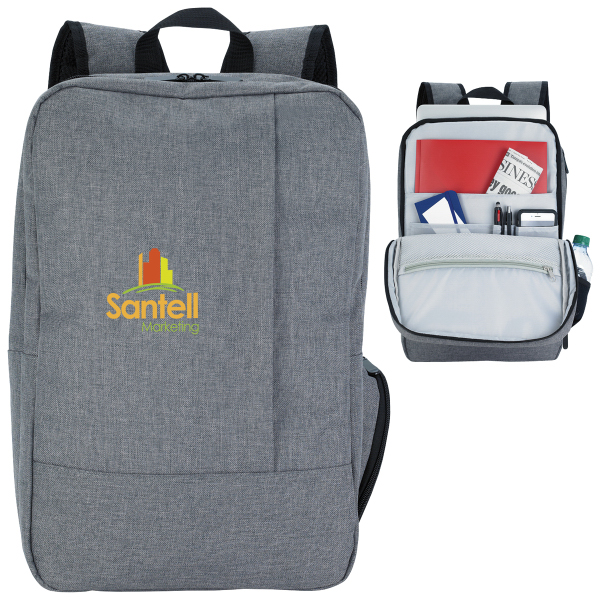 KAPSTON (TM) Pierce Backpack. 600 Denier Polyester. KAPSTON (TM) Pierce Backpack. Give an upscale look to your backpack with this modern and subtle look! Zippered main compartment with padded laptop sleeve. Front zippered compartment with inside organizer for business cards and pens. Exterior vertical zippered pocket and zippered side pocket for additional storage. Padded back and shoulder strap. Product Size: 11" w x 17 3/8" h x 5 1/2" d.