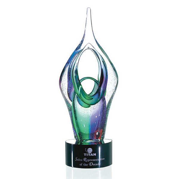 Make the stunning Kara Award the centerpiece of your next awards ceremony! This 24% lead crystal trophy set on a glass base calls attention to your recipient and maximizes your brand recognition. Each piece is an individual work of art; size and color will vary. This trophy matches accomplishments in arts and entertainment. Free 24-hour service. This exclusive award measures 5" W x 11-1/4" H x 2-1/2" D with the base at 4" diameter x 2-1/16" H.