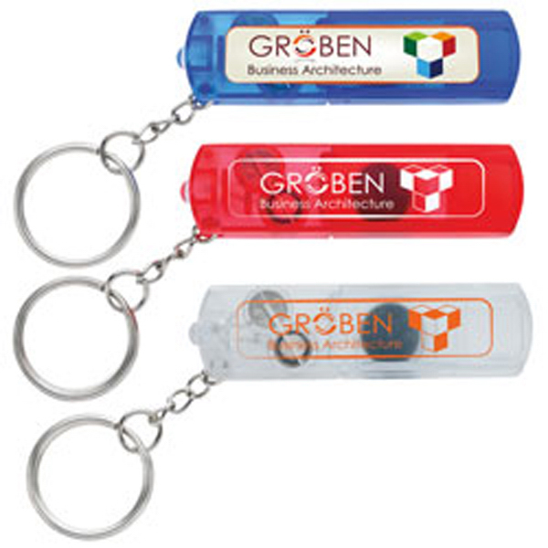 Show your customers the way with this promotional tool! The perfect accessory for your keys, this compact keylight features an LED light, built in whistle, decorative compass and split-ring keychain. The bright red LED allows you to find what you need. The whistle on the opposite end provides added security. This product includes button batteries, inserted. Primarily used for advertising not a precision instrument. Great for safety promotions!