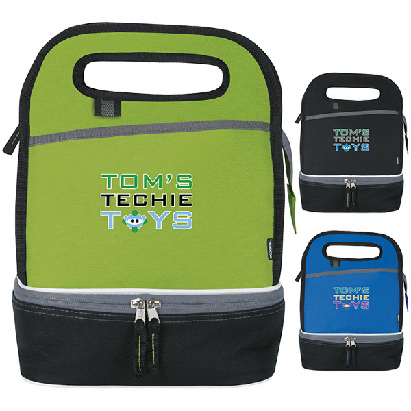 Exclusive. The Original Chill (TM). 600 Denier Polyester. KOOZIE (R) Duplex Lunch Kooler. Perfect for a lunch on the go, this cooler features multiple storage areas. The bottom opens to reveal a large insulated area, while the handles open to reveal a zippered main storage area. A front slip pocket provides added storage for condiments. Two large zippered main compartments. Bottom compartment ideal for plastic container. Front slip pocket. Dual integrated carrying handle. PEVA sewn interior liner.