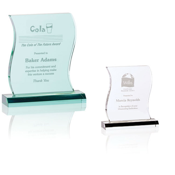Reward those who've achieved real transformation in your company with the Metamorphosis! Here's a great award for those who achieve their sales goals. Available in clear and green, this distinctive curved trophy beautifully shows up your company logo and message. This award is sized at 6-1/2" W x 7-1/8" H x 2" D and will stand proudly on any desktop or mantle. Recognize the best in your business and they'll never forget you. Order now!