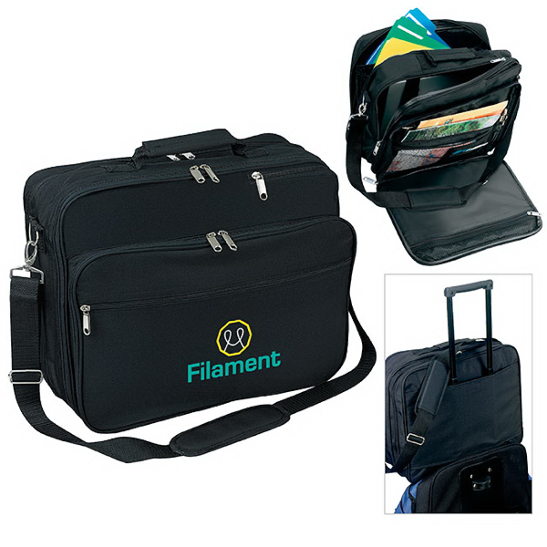 Paramount Brief. Supreme storage, simple look! Made of 300 Denier Polyester. Padded computer sleeve. Large main compartment with zip closure. Back sleeve fits over rolling trolley bag for easy traveling. Fits up to a 17" laptop. Adjustable shoulder strap. Product Size: 15 3/4" w x 12 1/2" h x 7" d, Handle: 1 1/2" w x 48" l.
