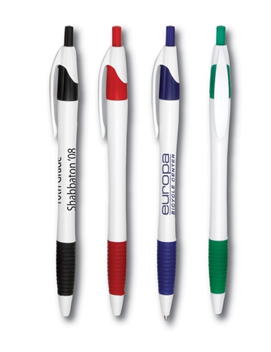 This retractable pen, with its curvaceous contoured body, has become one of the most popular pens in the advertising industry. White barrel and bold, colorful accents. It has an hourglass shaped barrel and rubber grip, you can't go wrong with this style. For the high quality and durability, low low price you simply won't find a better deal.