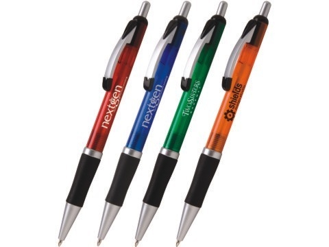 Economical push action retractable. Brilliant translucent barrels. Matte silver accents and attractive bowed clip. Contoured comfort grip and smooth writing blue ink. Recommended imprint colors: black, silver, white