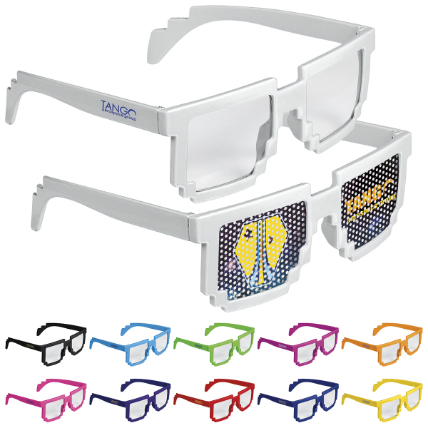 Pixel Glasses. Classic plastic folding eyewear with UV400 protective lenses. Optional sticker-on-lenses available. Assorted Colors available at no extra charge, too! Great promotional item. Pack 20.