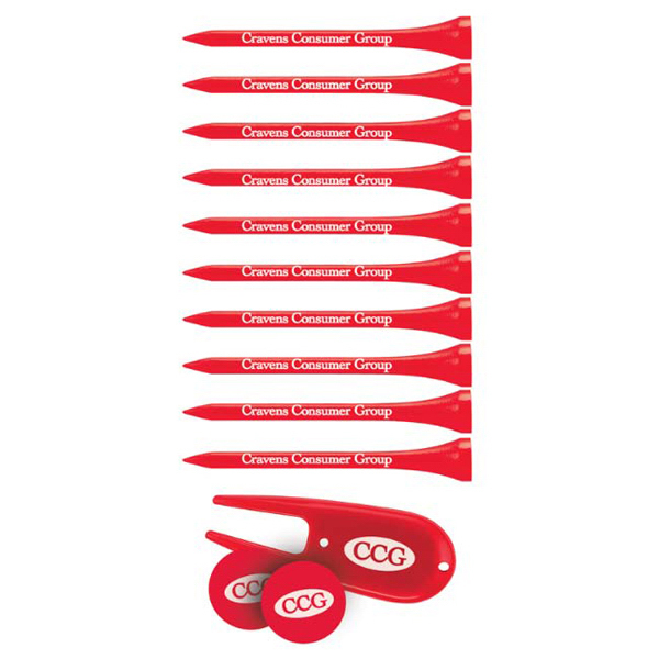 You won't be able to wait to hit the golf course when you are equipped with the Rip It Pak! The USA-made golf pack features ten imprinted 3 1/4" tees, 2 imprinted quarter marks and 1 imprinted divot repair tool in individual polybag 4"w x 6"h x 1/2"d. The tees are made of wood and the quarter mark and divot tool are made of plastic. Each golf item leaves space for you to imprint a personal message or your company name or logo. Ideal for company golf tournaments!