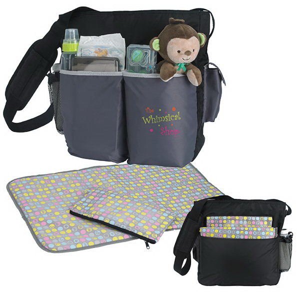 Good Value (R). Tot Diaper Bag. 420 Denier Polyester. This modern diaper bag is a perfect fit for men and women! The neutral color is ideal for any baby gender and the back pocket is great to insert the changing pad for easy diaper change. Large main compartment with zip closure. Includes changing pad and mini bag exclusive design.\nFive exterior pockets (one in the back) and interior pockets for easy organization.\nAdjustable shoulder length handle. Product Size: 12 3/4" w x 13 1/2" h x 5" d.