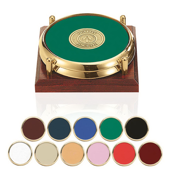 Decorative and durable, this set of two coasters with its solid cherry tray and columns is truly a "solid" gift! The image is shown with the QC Medallion. With measurements of 4" square x 1-1/4" H, this elegant set will highlight your next office party. Order yours today!