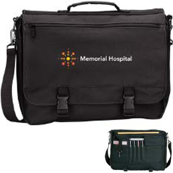 The Typhoon Deluxe Briefcase is one of our most popular bags! Equipped with all the pockets and features you need in a briefcase. Made of 600 Denier Polyester. Front flap and buckle closure. Interior organizer, multiple interior zip pockets and interior clip. Bottom unzips to expand size to 6"d. Adjustable shoulder strap. Product Size: 16 3/4" w x 12 1/2" h x 3 1/2" d, Handle:1 1/2" w x 48" w. Wounded Warrior Project.
