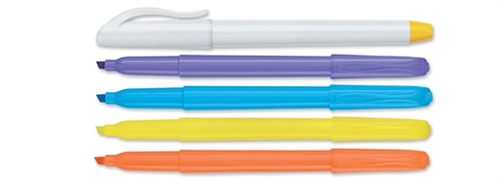 The Pocket Highlighter adds fun and excitement to your promotional message. A fashionable clip and several vibrant barrel colors turn a simple highlighter into a colorful, traveling billboard. Your logo is highlighted with style with the Pocket Highlighter! Smear Guard smear-resistant ink. Ink color matches cap color. White barrel has yellow ink.